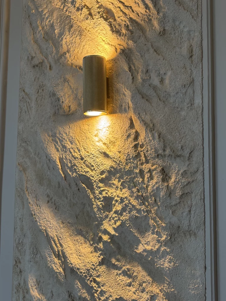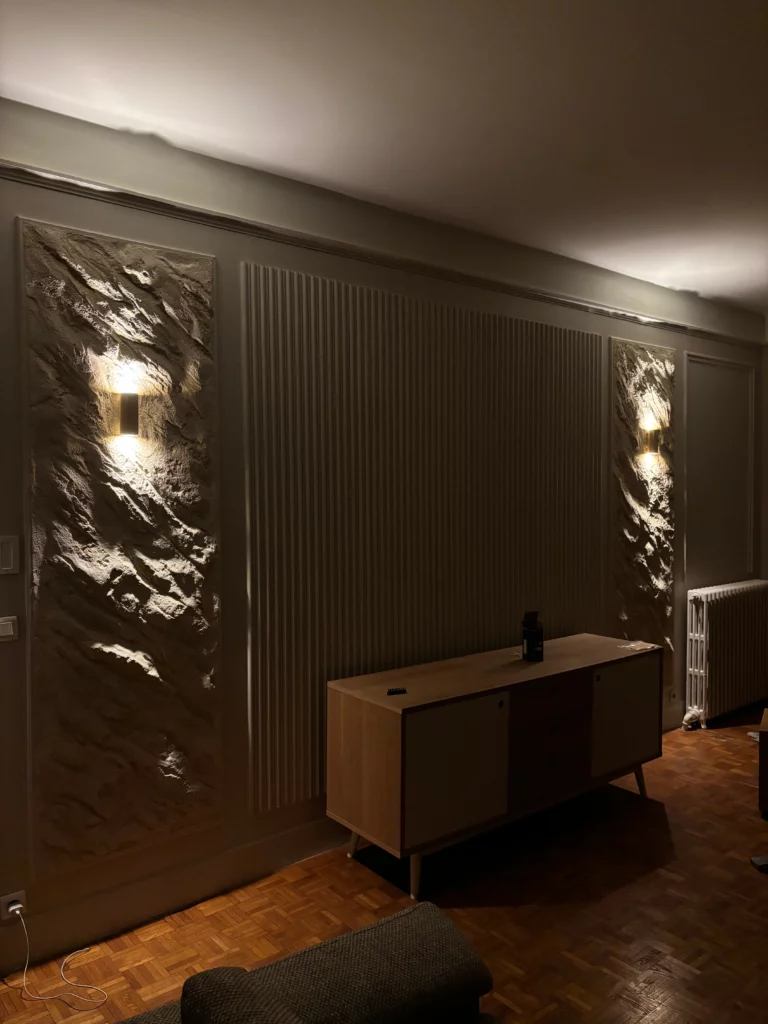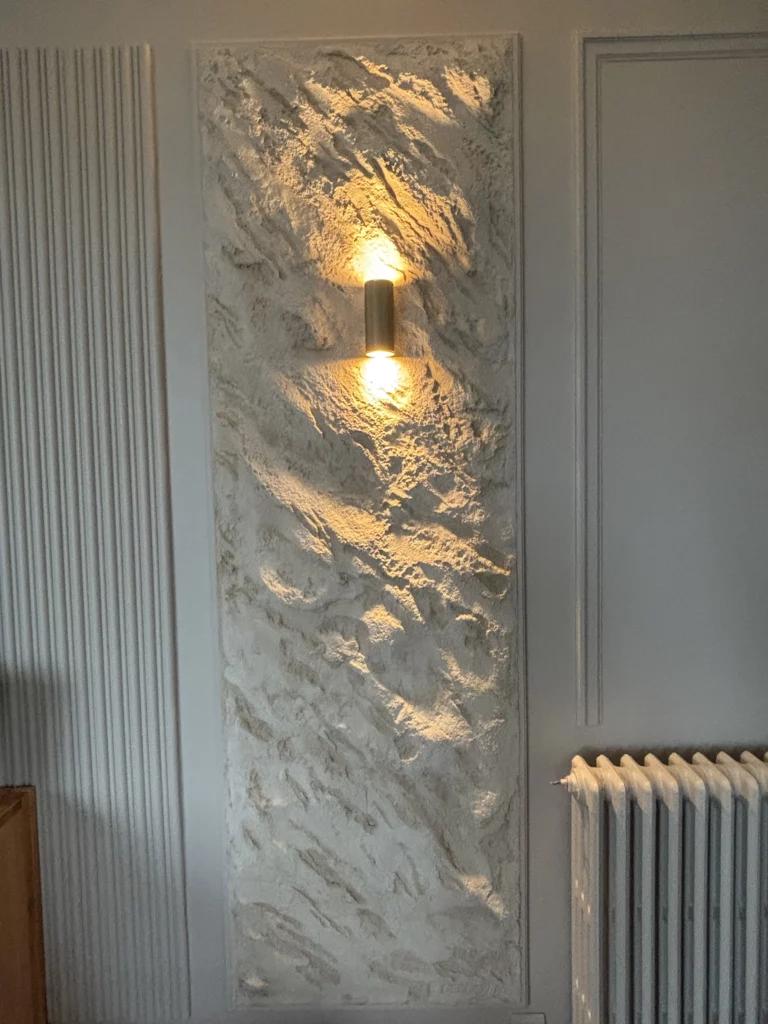 J’ai également intégré un travail de matière avec un effet roche, en écho à l’environnement naturel de la maison, située sur les hauteurs de Pontoise, dont le relief est historiquement constitué de roche. Ce parti pris décoratif crée un lien subtil entre l’architecture intérieure et le paysage qui entoure la maison.